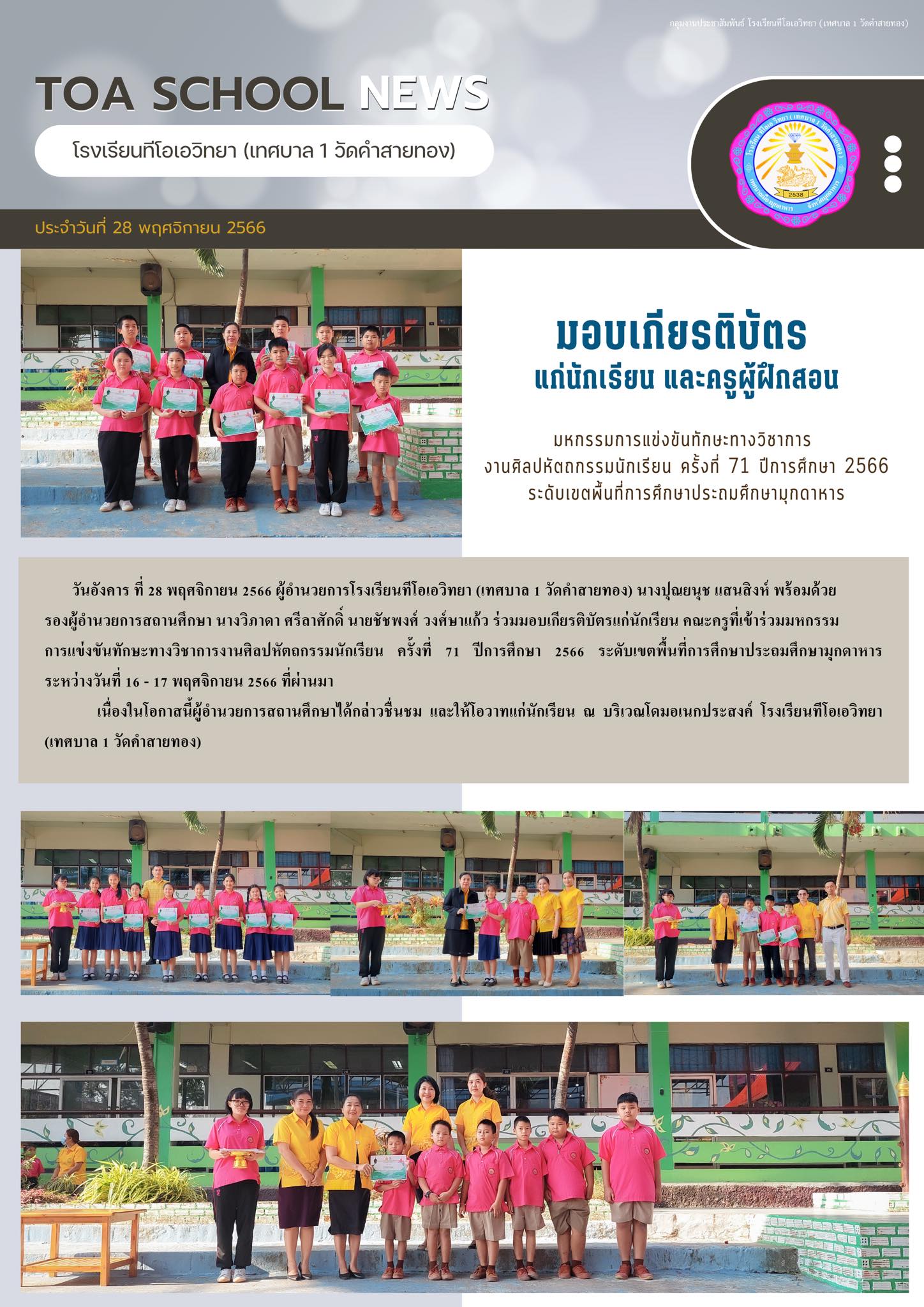 วันอังคาร ที่ 28 พฤศจิกายน 2566 ผู้อำนวยการโรงเรียนทีโอเอวิทยา (เทศบาล 1 วัดคำสายทอง) นางปุณยนุช แสนสิงห์ พร้อมด้วยรองผู้อำนวยการสถานศึกษา นางวิภาดา ศรีลาศักดิ์ นายชัชพงศ์ วงศ์ษาแก้ว ร่วมมอบเกียรติบัตรแก่นักเรียน คณะครูที่เข้าร่วมมหกรรมการแข่งขันทักษะทางวิชาการงานศิลปหัตถกรรมนักเรียน ครั้งที่ 71 ปีการศึกษา 2566 ระดับเขตพื้นที่การศึกษาประถมศึกษามุกดาหาร ระหว่างวันที่ 16 - 17 พฤศจิกายน 2566 ที่ผ่านมา